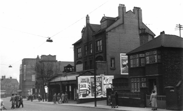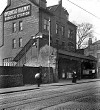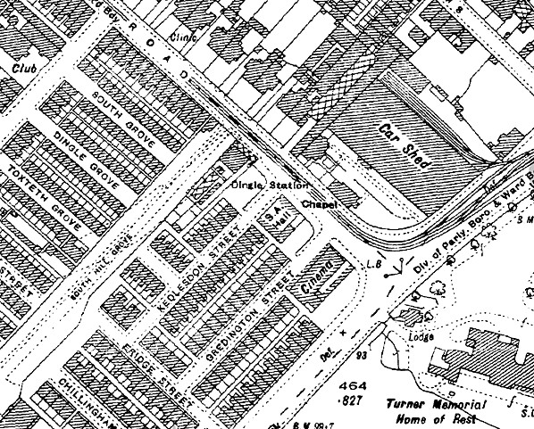 The Southern Extension and Dingle station opened on 21 December 1896. At street level the station was on the western side of Park Road close to its junction with Dingle Lane. The station building was a three-storey brick structure whose canopy extended over the pavement. On the ground floor were the ticket office and a kiosk. On the first and second floors were offices. At the rear of the building a pedestrian subway led down to platform level. Lined in yellow brick the subway was divided into two by a handrail, and passengers descending to the platform were separated from those leaving the station. Within the subway were two sections with steps but, in the main, the subway was in the form of a ramp. |