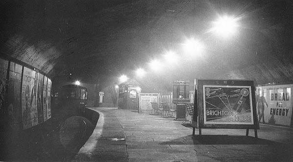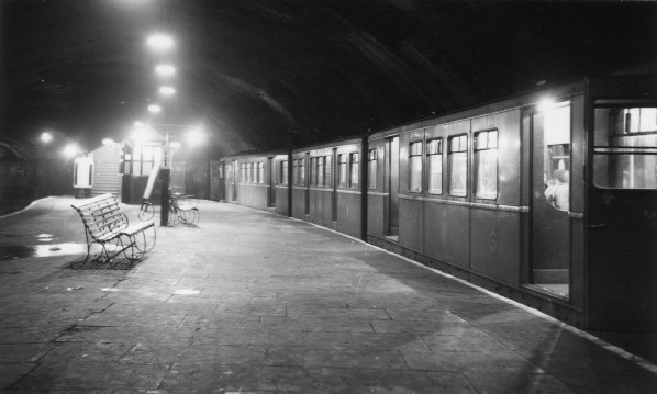 From the point where the pedestrian subway entered the large tunnel passengers crossed a single line by an iron footbridge; this connected to a flight of stairs down to an island platform, 28ft wide and 170ft long. The curving platform had two faces and was provided with a ticket collector’s hut and waiting shelters.