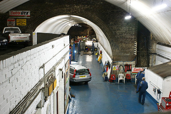![]() Looking east from the site of the footbridge that connected the pedestrian subway to the platform at Dingle station in March 2012. The tunnel seen in the middle distance was the dead end tunnel used for reversing trains. In March 2012 the station site was in use by Roscoe Engineering as a car repair workshop. The company had occupied the station site since 1977.