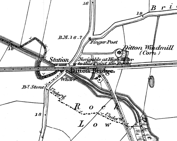 The station was on the east side of Ditton Brook over which the double-track line passed on a bridge. The station was named after a nearby windmill. In the 1850s the area around the station was rural and sparsely populated.