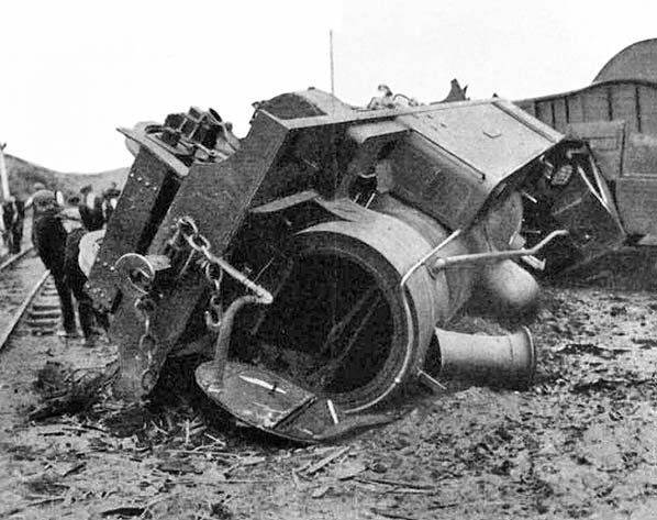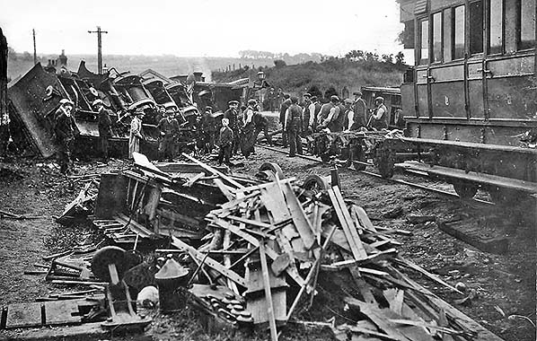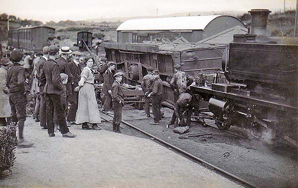 ![]() In this view looking south the 7 September 1913 crash is clearly illustrated. Donemana station was a passing point on the MR’s single track Derry/Londonderry – Strabane line. The station with its two platforms and twin tracks can be seen beyond the wreckage. To the left is the overturned locomotive that had been hauling the 9.00pm Londonderry Victoria Road to Strabane train when it passed over a 6mph restricted section of track at an estimated speed of between 30 and 40mph. Next to the overturned engine is an overturned coach which is blocking the down loop line. Workmen appear to be engaged with the wrecked coach whilst officials and curious locals watch the activity. ![]() A view taken from the goods yard of Donemana station looking north. The station signal cabin can be seen to the left. A group of people can be seen posing in front of overturned CDR locomotive number 9 'Letterkenny'. The engine seems to have struck an open wagon that was standing in the yard. The wagon appears to be leaning slightly. ![]() Locomotive number 9 'Letterkenny' as it had come to rest after it had overturned due to excessive speed on Sunday evening of 7 September 1913. The line which it was travelling along is seen to the left. ![]() Photographs of the Donemana accident clearly show that it was a big draw for local people. In this view a group of individuals are seen looking at the overturned coach whilst railway employees continue with the clear up. ![]() The north end of Donemana station showing the overturned locomotive, a badly damaged coach and wreckage from the accident. ![]()
