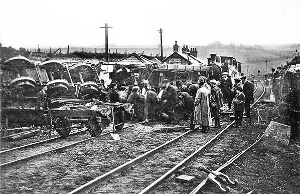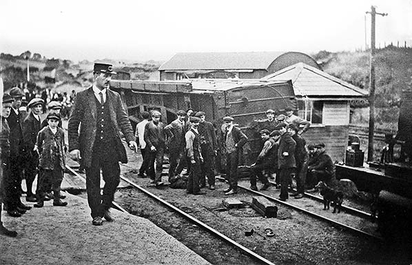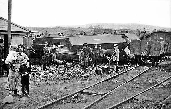 ![]() Railway workers and interested locals are seen posing for the camera with a wrecked coach as the backdrop. This view was taken at the north end of the station and the goods shed can be seen in the background. ![]() Another view taken at the north end of the station showing the overturned coach. A member of the station staff, possibly the Station Master, is seen walking along the up platform. Young boys and even a dog appear to have been drawn to the scene.