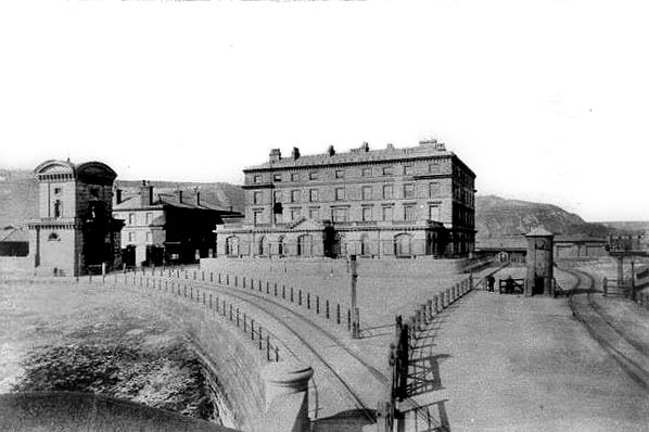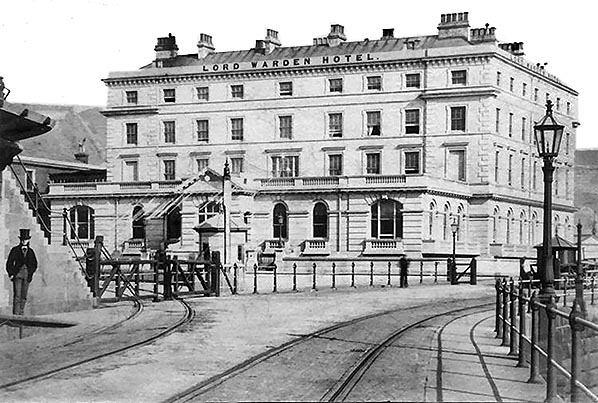 ![]() The ‘Lord Warden’ Hotel in 1898. The hotel opened in September 1863 and was aimed at the wealthier cross-Channel travellers. To accommodate them a covered walkway was built between Dover station, seen on the left, and the first floor of the hotel. The walkway linking the two buildings can just be made out in this view. The end of the pedestrian walkway along the pier, which is about 15ft above track level, is seen on the far left.
