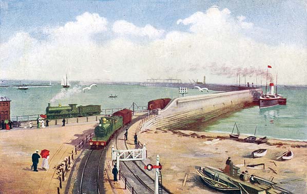 ![]() Admiralty Pier seen from the ‘Lord Warden’ Hotel in 1901. By now the LC&DR and the SER have amalgamated as the South Eastern & Chatham Railway and locomotives are seen on each of the lines. Work has started on the pier extension; the turret which was at the end of the pier can be seen to the right of the gantries. This a hand tinted postcard; the original photograph is below. Some artistic licence has been used with the addition of the two people strolling along on the left. There are some additional children to the right of the signal box and a couple of extra boats in the harbour. ![]() ![]()