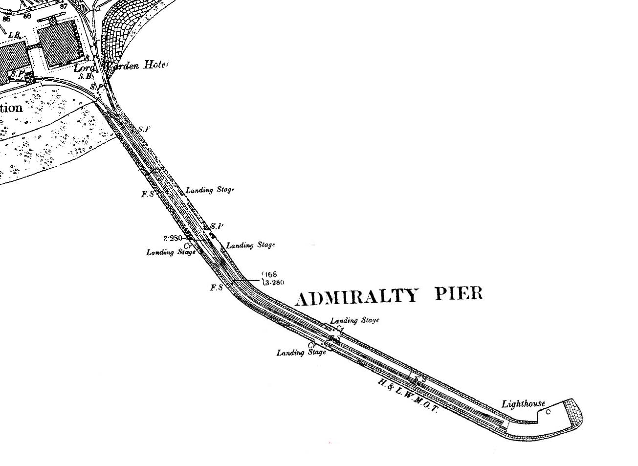 ![]() 1895 1:2,500 OS map. This shows the pier as completed in 1871. There are two railway lines running the full length of the pier. The end of the pier has been deliberately left blank on the map apart from the lighthouse, as it is an active military installation so the turret and a number of military buildings are omitted for reasons of national security. Landing stages are seen on both sides of the pier. The passenger platform is not shown; it was on the west side beneath the promenade. The junction between the SER and LC&DR lines is seen at the top, the SER line to the left passing Dover Town station and the LC&DR line to the right passing the ‘Lord Warden’ Hotel. A signal box is shown close to the junction adjacent to the LC&DR line. ![]()