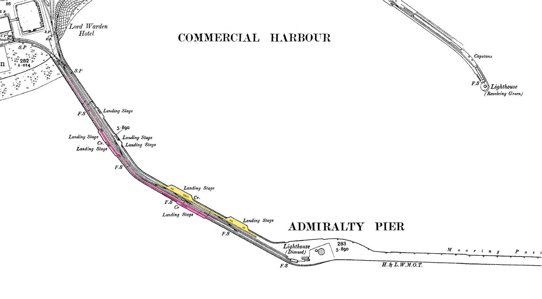 ![]() 1907 1:2,500 OS map shows the pier after the extension had been built. Work around the turret was still underway at this time but, again, all detail as been omitted as this part of the pier remained an active military site. The lighthouse is marked as disused because a new lighthouse had been built at the new pierhead. There is no obvious change to the pier facilitates; another platform had been provided by this time but its position is not shown. The original platform beneath the promenade is indicated in red. The new platform that was built in 1906 and linked two landing stages is indicated in yellow. ![]()
