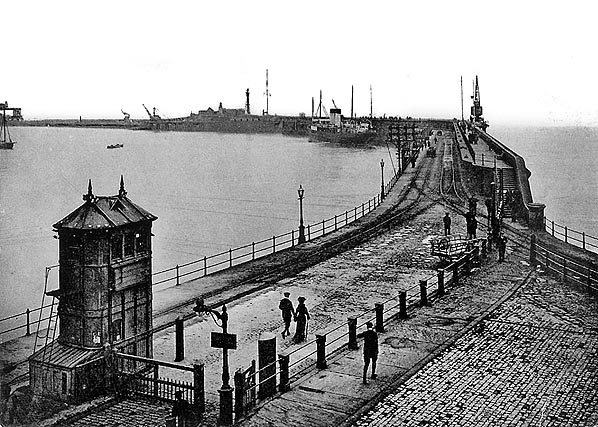 ![]() The Admiralty Pier seen from the Lord Warden Hotel c1904. A locomotive is seen heading towards Dover Town station on the far right. The extension to the pier is progressing well and it has now reached its final length of 4,140 feet. Work is still underway at the pierhead where an overhead gantry is seen. The narrow platform edge can just be made out beneath the promenade above the first