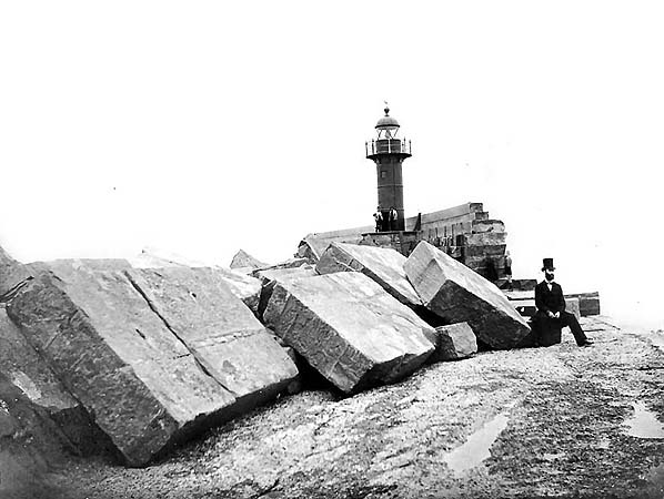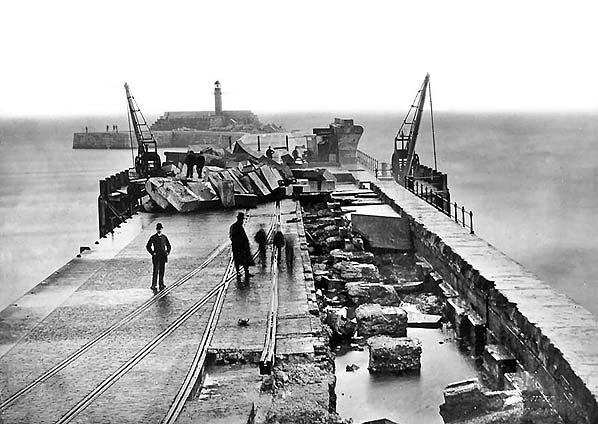 ![]() Damaged to Admiralty Pier following the storm on 18 January 1881. "It was Dover’s biggest storm for forty four years. Around the Town houses lost their roofs, cellars were flooded and in the harbour vessels were completely submerged. Even the Admiralty pier didn’t escape. Huge 1.5 ton blocks were ripped up from their seatings and iron gates ripped from their hinges. The mail train was disrupted due to the rails being torn up and lamp posts were snapped off. Iron railings were ripped away and telegraph wires destroyed.