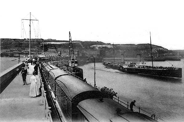 An Ostend ferry has just departed from the Admiralty Pier before September 1907. A train waits at the platform below the promenade.