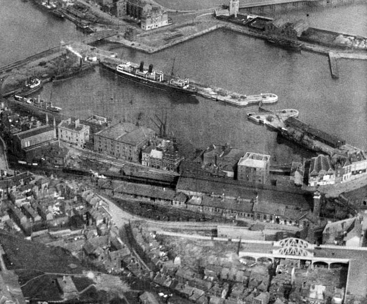 ![]() Dover Harbour station seen from the air in 1920, seven years before closure. At the bottom of the picture the viaduct which bypassed Elizabeth Street and the busy level crossing at the south of the station is under construction. Granville Dock is seen to the south with Wellington Dock to the east, access to both being controlled by tidal locks. Prince of Wales Pier is seen top right. Reproduced with the kind permission of Simmons Aerofilms Ltd ![]()