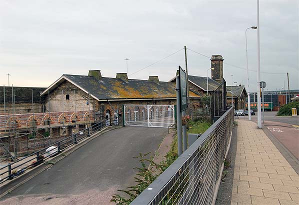 Dover Harbour station seen from Elizabeth Street in September 2014. On the left a demolished part of the building is being rebuilt as a freight office by the new owner in a style in keeping with