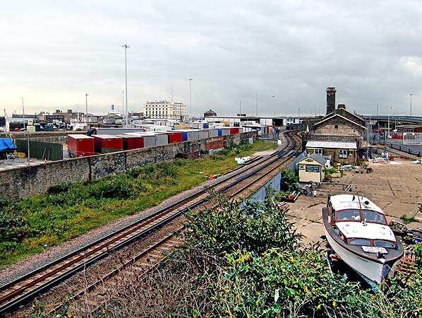 Dover Harbour station and the site of the sidings seen from Limekiln Street bridge in September 2014. The Lord Warden Hotel dominates the skyline.