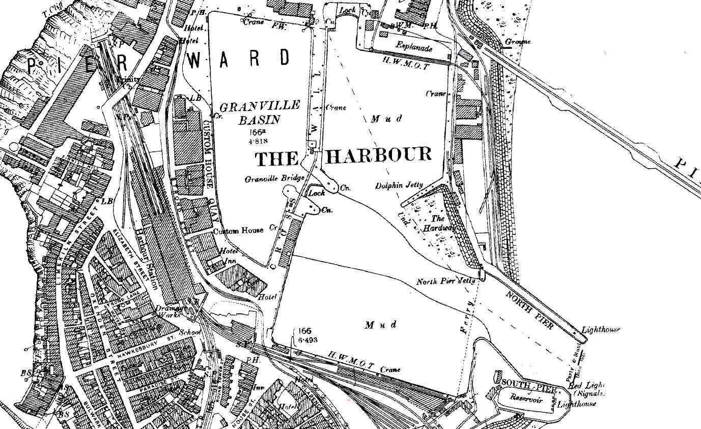 ![]() 1898 1:2,500 OS map. The Hawkesbury Street curve linking the LC&DR line with the SER line had now been built; this necessitated the removal of the end wall of the trainshed. The footpath crossing the line to the south of the station has been replaced with a footbridge, and a signal box to control the new junction has been built at the south end of the up platform. A second siding behind the up platform has been added. The Prince of Wales Pier is under construction at this time. ![]()