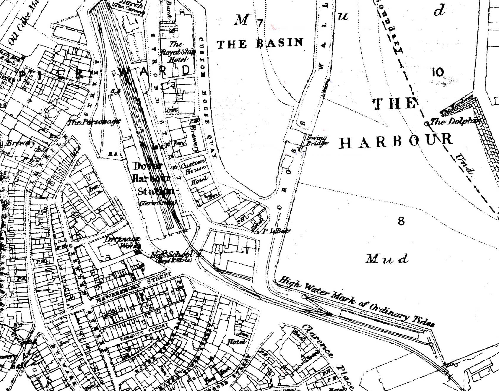 ![]() 1865 1:2,500 OS map shows Dover Harbour station as built. Although the station is shown as a terminus one line continues south alongside the harbour towards the Admiralty Pier. The station never had goods facilities but did handle parcels and one siding is shown running behind the platform on the west side. ![]()
