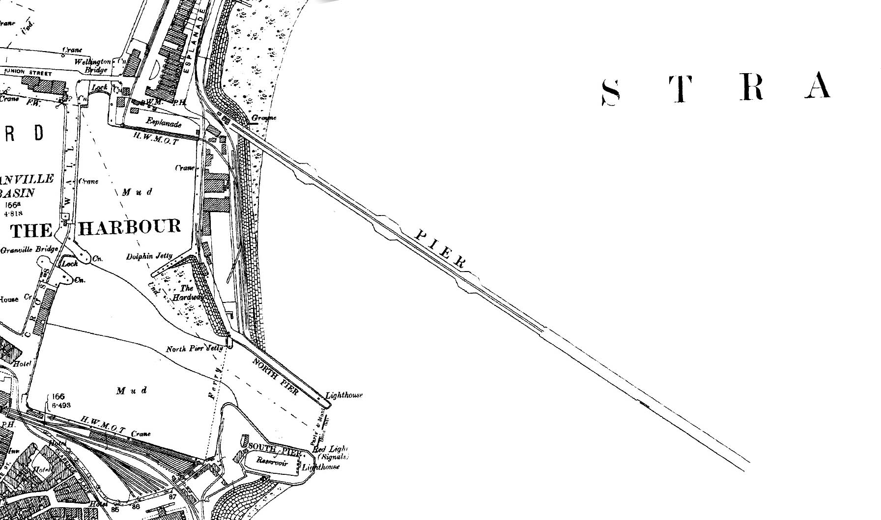 1898 1:2,500 OS map shows the pier under construction. Although named 'Prince of Wales Pier' in 1893 it is just identified here as 'Pier'. The 'Granville clock tower' has not yet been moved and is seen here in line with the entrance to the pier. The ‘Esplanade’ Hotel is also blocking the route of the future railway line. The three bays either side are covered areas to provide protection from the weather for members of the public using the pier.