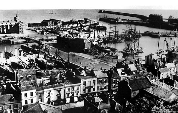Dover Harbour seen from the Western Heights c1890, before the Prince of Wales Pier was built. The swing bridge over the entrance to Wellington Dock is seen top left. This is the original bridge which was opened by the Duke Of Wellington on 13 November 1846. Arthur Wellesley, the first Duke of Wellington, was Lord Warden of the Cinque Ports from 1829 until 1852. In 1904 as a result of widening the entrance to Wellington Dock, a new iron bridge was built by Messrs Hunter & English at the cost of £4,738. At the same time a railway line was laid on the bridge to give access to the Prince of Wales Pier.The Esplanade Hotel is seen in front of the bridge. This stood on the route of the railway line and the central section was demolished to allow the railway to reach the pier. Click here for a larger version.