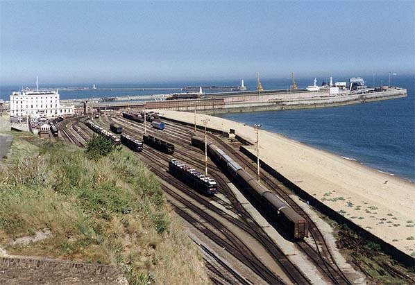 Dover Town Yard and beyond it the site of Dover Town station c1992. Railfreight which ran to/from the UK by train ferry was marshalled here before the Channel Tunnel opened. There were daily services of freight trains ran between Dover Town and Willesden Brent (London), Bescot (Birmingham) and Basford Hall (Crewe). There is a ship tied up at the Western Docks in the background, and although it is not the train ferry, the 'new' linkspan for the train ferry can be seen a little further along to the right.