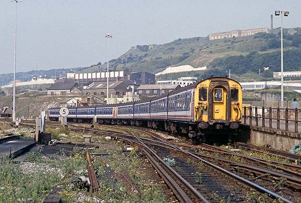 In July 1994 the 08:55 from Victoria is passing through the Dover Town yard on the approach to Western Docks. The rebuilt Dover Town platform is seen on the right. , The remains of Archcliffe Fort are seen on the far right. The south side of the fort was demolished in 1928 to allow the Southern Railway to lay additional tracks. Part of the Western Heights defences are seen on the cliff top.