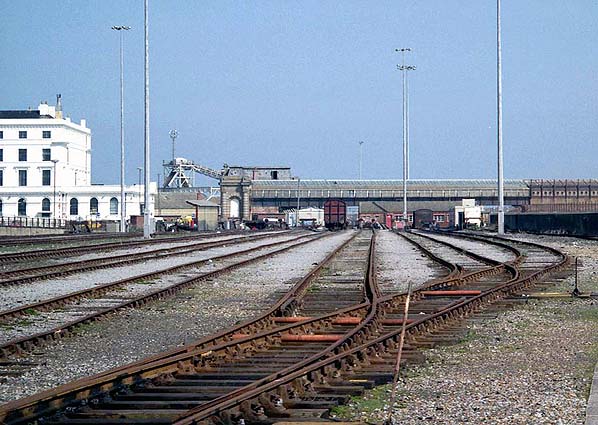 The site of Dover Town station (left) and the west end of the Dover Town Yard in April 1996, shortly after closure of the yard. The pedestrian entrance to Dover Western Docks station with its raised walkway is seen in the background.