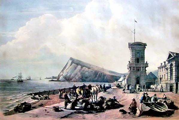 Dover Pilot's tower in the 1850s, before the line to the Admiralty Pier was built. To avoid demolishing the tower the Pier line passed through the ground floor of the tower. It was eventually demolished in 1913 when a second track us required. The 'Lord Warden Hotel' is seen to the right with the Town station behind it.