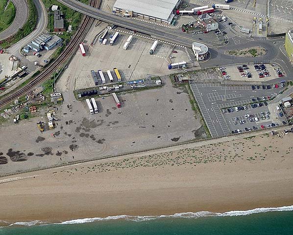 Recent aerial vierw showing the site of Archchcliffe Junction and the surviving part of the original Dover Town platform. The platform was larer rebuilt on a curve to allow the line to run in to Dover Marine. The line of that curve is clearly seen along the right edge of the car park at the bottom.