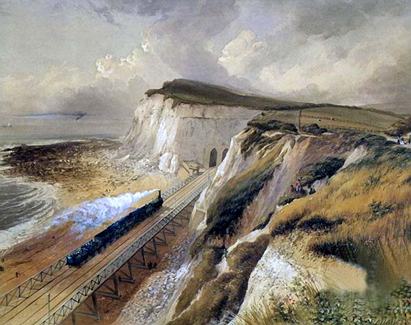The first train has just left Dover station on 7 February 1844 and is about to enter Shakespeare Tunnel. The last two coaches are third class and open topped. These brought regular complaints from passengers as sparks from the engine burned their clothes. It was suggested by the SER that to avoid this problem they should travel first class!. The line is on wooden trestles across Shakespeare beach.