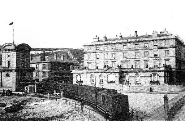 A train has just left Admiralty Pier and is heading towards the Town station circa early twentieth century. The Town station is seen to the left of the hotel and the high level bridge linking the two buildings can be seen. The building on the far left is the Dover pilots tower. This built in 1848 to replace the pilot's station on Cheeseman's Head that was demolished to make way for the South Eastern Railway track. When the line to Admiralty Pier was built the tower was in the way and, rather than replace it the ground floor was gutted to allow trains to run through it!.