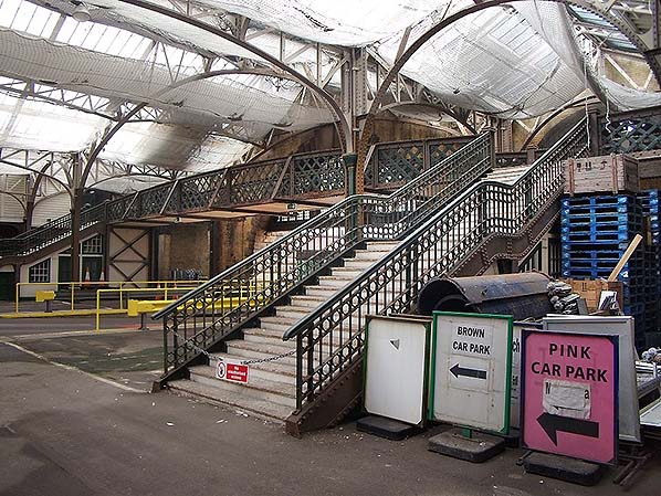 The footbridge across the platforms at the north end of the trainshed in June 2006. The entrance into the station from the elevated covered walkway is to the left.