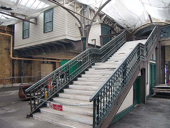 ![]() Station Name: DOVER MARINE/DOVER WESTERN DOCKS![]() The footbridge across the platforms at the north end of the trainshed in June 2006. These are the steps from platforms 5 and 6. The elevated walkway is through the green gate at the top of the steps Photo by David Todd ![]()