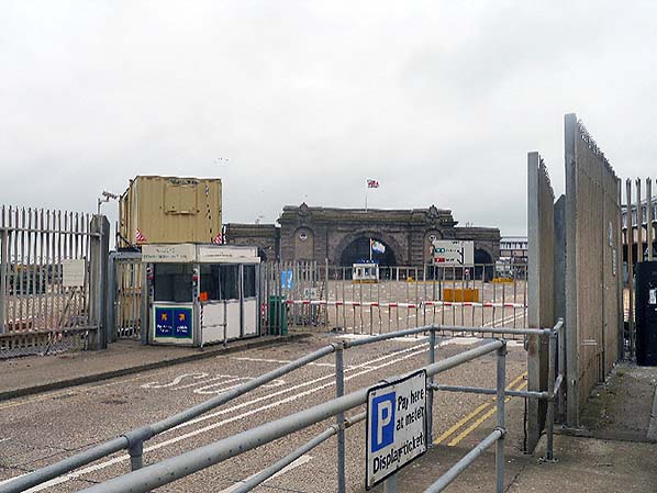 ![]() Station Name: DOVER MARINE/DOVER WESTERN DOCKS![]() Entrance to the cruise terminal in April 2015. This is a secure area with no access to the public, except for cruise passengers. The elevated walkway is seen behind the fence on the right. Photo by David Todd ![]()