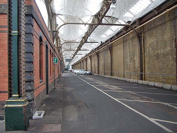 Looking south along platform 6 at Dover Western Docks station in June 2014; the west side of the trainshed is on the right.