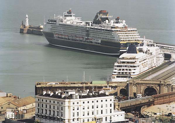 A modern view of the cruise terminal and Dover Western Docks Station