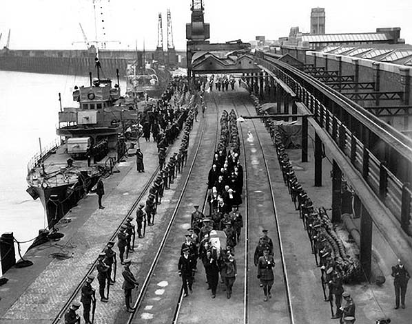 On 10 November 1920, the coffin holding the body of the Unknown Warrior was taken to Boulogne where HMS Verdun lay waiting to bring him home to Britain. As HMS Verdun approached Dover, the Prince of Wales Pier was overflowing with people who had come to pay their respects. The town’s shops had closed, and flags were flown at half mast. Six bearers, Lieutenant-Colonels or the equivalent rank from all of the armed forces, boarded the ship, and the coffin was received by General Sir J. Longley, Commander of the Eastern Area, and Colonel Knight, Commander of the Dover Garrison. The party processed to the western platform of the Marine station, from which the train to London was due to leave at 5.50pm. A plaque now commemorates the Unknown Warrior’s home-coming. The coffin was placed in passenger luggage van No.132 of the South Eastern and Chatham Railway Company, the same van which had carried the bodies of Nurse Edith Cavell and Captain Charles Fryatt. Frostation the Unknown Warrior was to London for burial the following day at Westminster Abbey.