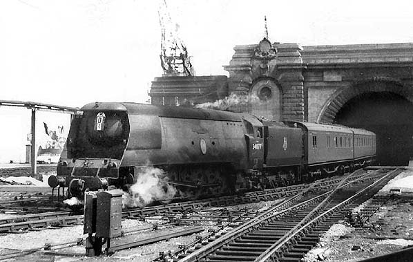 A boat train is seen leaving at Dover Marine station in the 1950s. 34077 was one of Bullied's Light Pacifics built in July 1948 at Brighton works. This Battle of Britain Class was named 603 Squadron and was rebuilt at Eastleigh works in July 1960, when the air smoothed casing and chain driven valve gear was removed. Lasting well into the last year of Southern steam, it was withdrawn in March of 1967 and scrapped in August that year.