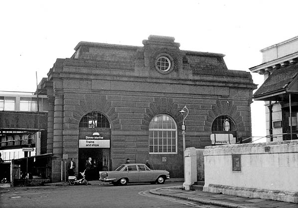 ![]() Station Name: DOVER MARINE/DOVER WESTERN DOCKS![]() Dover Marine station entrance opposite the ‘Lord Warden’ hotel in September 1973. The entrance on the left was for passengers using the station. The sign above the entrance on the right reads 'Promenade and fishing only'. The steps and the footbridge were divided with cast iron railings. Photo by John Mann ![]()