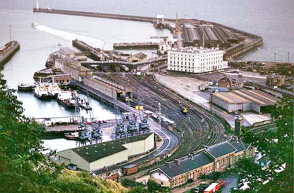![]() Station Name: DOVER MARINE/DOVER WESTERN DOCKS![]() An overall view of Dover Western Docks taken from the Western Heights circa late 1970s. The station and the train ferry dock are seen linked by a long footbridge. No train ferry is berthed. The vessel departing is a Jetfoil en route to Ostend. Copyright photo from Eastbank Model Railway Club web site ![]()