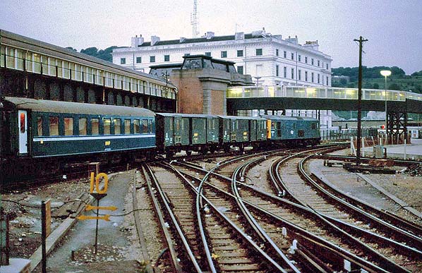 ![]() Station Name: DOVER MARINE/DOVER WESTERN DOCKS![]() The 'Night Ferry' is seen arriving at platform 6, Dover Western Docks station circa late 1970s. The sleeping car is one of three that was repainted in the lighter blue of the SNCF. Copyright photo from Eastbank Model Railway Club web site ![]()