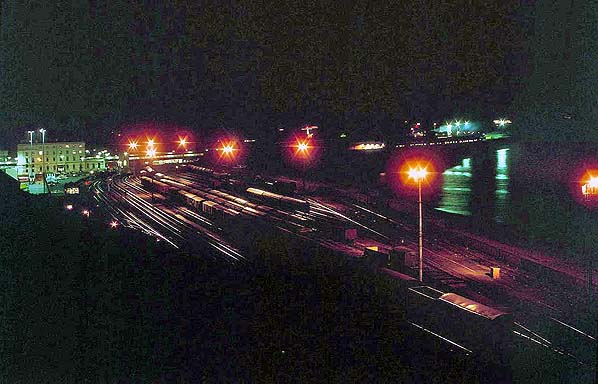 ![]() Station Name: DOVER MARINE/DOVER WESTERN DOCKS![]() A nocturnal view of Dover Town sidings circa late 1970s. After the demise of the 'Night Ferry', the freight traffic increased especially after a new berth and link span was constructed on tidal waters. The Lord Warden hotel is seen on the left Copyright photo from Eastbank Model Railway Club web site ![]()