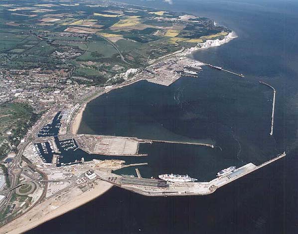 ![]() Station Name: DOVER MARINE/DOVER WESTERN DOCKS![]() Aerial view of Dover Harbour in the 2000s. The Eastern Docks are seen at the top with the Western Docks and the Admiralty Pier at the bottom. Dover Hoverport is in the centre. The Western Docks station trainshed is clearly seen and by this time had been refurbished as a cruise terminal. Ferries now run from the Eastern Docks. Note the two entrances to the dock, separated by the Southern Breakwater. ![]()