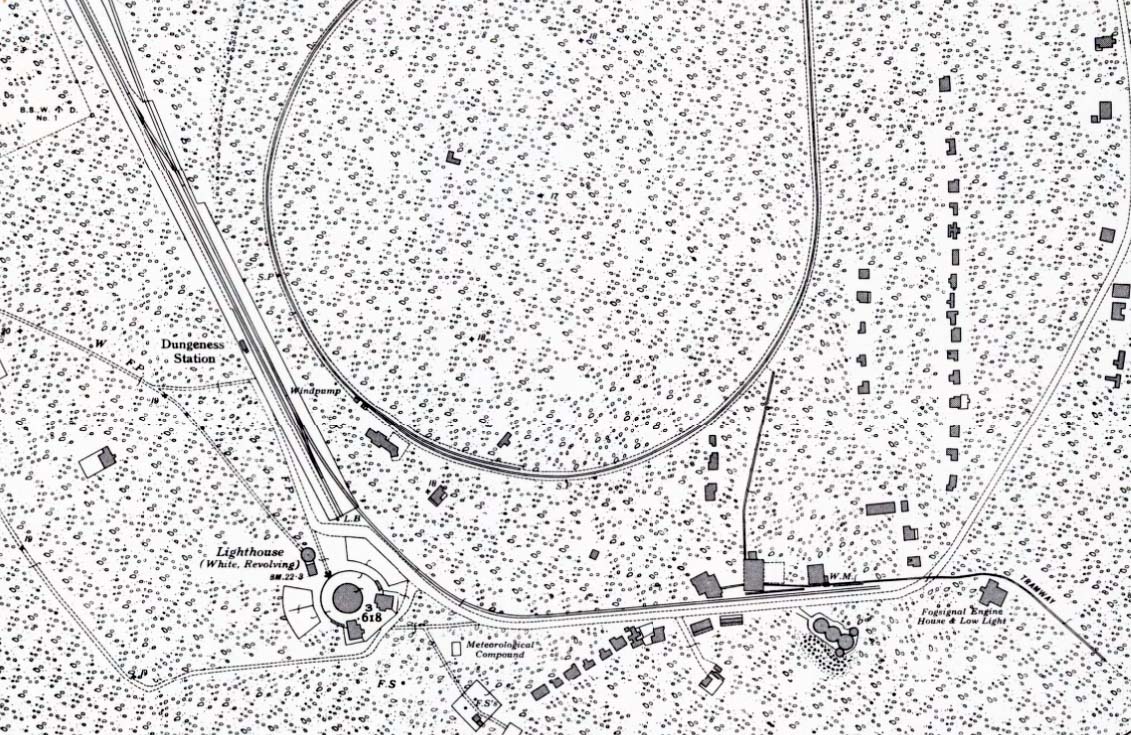 Although closed in 1937 Dungeness station is still shown on this 1946 1:2,500 OS map. Some time after 1907 the l;ine was extended onto the beach. The curving track to the right is the turning circle at the end of the Romney Hythe & Dymchurch Light Railway.