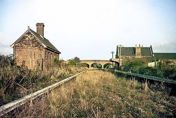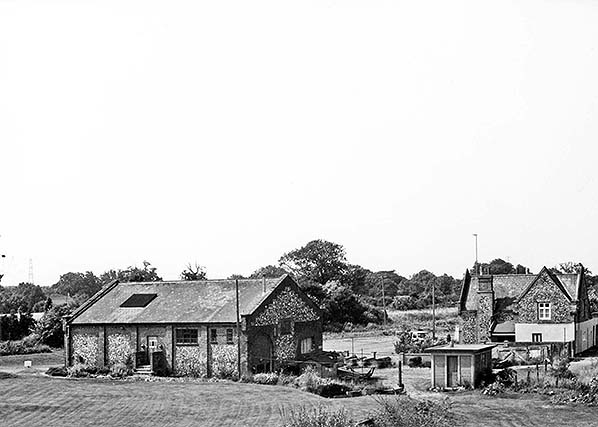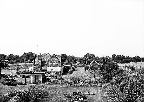 Photo by John Mann ![]() Looking north-west across Dunham station from Station Road in July 1982. The goods shed is unusual as it had two openings in the north end. The rails went through the furthest opening. The main cart access was on the far side so this second opening must have been a secondary access for carts to back up to the internal dock.