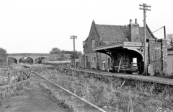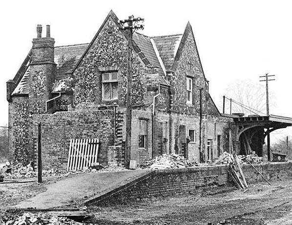 Photo from Norfolk by Rail Facebook group ![]() Dunham station looking west from the barrow crossing in January 1975. The post on the left was for an oil lamp. The barrow crossing was the main means of passenger access to the down platform and there was a lamp on each side of the crossing.