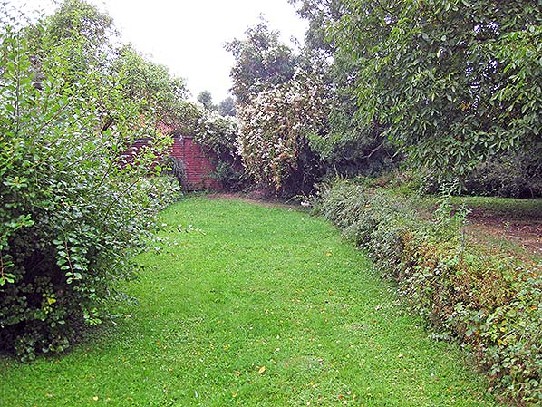 Photo by Evelyn Simak, reproduced from Geograph under creative commons licence ![]() Looking west along the track-bed alongside Dunham station house with its overgrown platforms, up side on the left. The fence crosses the line and forms the boundary between two properties: beyond it lies the down platform waiting room in September 2017.