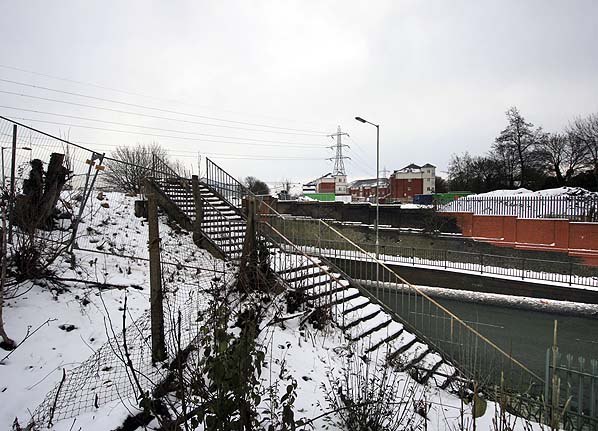 Steps up to the demolished pedestrian footbridge in December 2010.