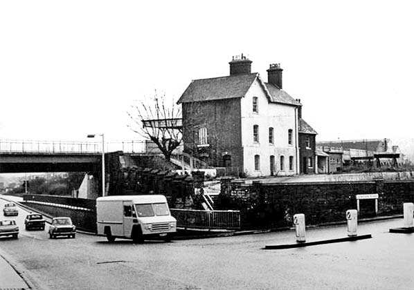 Dunstable Town station and goods yard seen from Church Street c.1965, probably after closure to passengers. The buffers at the end of two sidings are seen on the right. The goods
