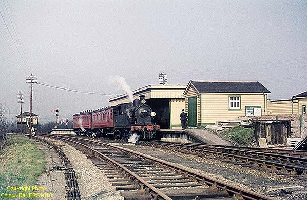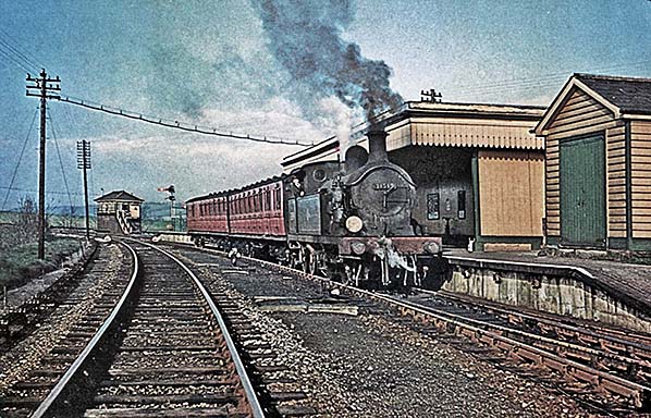 ![]() Dunton Green station looking towards Sevenoaks, left, and Westerham, right. The image is undated but is post 1955 as the running-in board on the left mentions Brasted Halt. Note the point rodding on the right, connected via cranks to pass beneath the tracks to the signal box. As can be deduced, mechanical signal box levers required a reasonable degree of physical fitness to operate but there was a knack to it and once this had been learned the job was quite easy. Note, too, that the face of the branch platform is of concrete with wooden edging while the London end of the Down main platform, far left, is of brick facing with stone or brick edging. The main line platforms had been extended in readiness for the 1935 electrification to Sevenoaks; the extended country end of the down main line platform was given concrete facing while the up main line platform appears to have been given concrete facing along its entire length at some point in time. The covered way linking the branch platform shelter with the up main line platform salter and the footbridge is seen. Photo from John Mann collection ![]() A further colour view of the branch train at Dunton Green, this time with Class H No.31164 on 21 March 1959. The train is one of the ex-rail-motor sets and the steam heating is doing its job. This views show more of the hotchpotch of wooden buildings which made up Dunton Green station at the time. The end of the main station building is seen on the far right; this survived until the mid 1990s, long after the other buildings had been demolished.