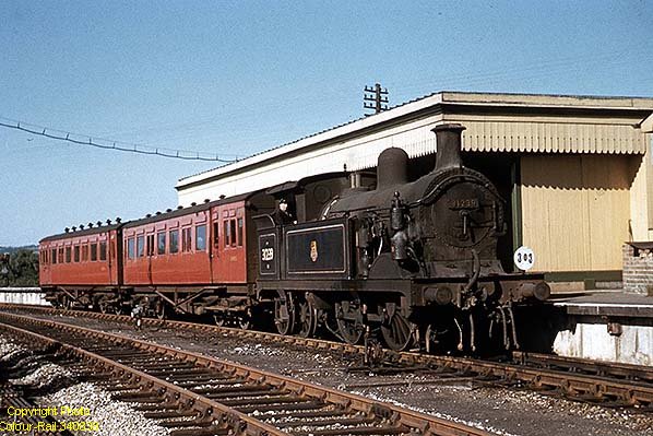 Copyright photo from Colour Rail BRS1810 ![]() On 14 June 1959 Class H No.31239 is in charge of duty 303 at Dunton Green. The locomotive is in the condition quite typical of the class which seemingly meant a filthy boiler and smokebox with near-spotless tanks, cab and bunker. Note that she still bears the early BR logo, facing forwards. The train is one of the ex-steam rail-motor conversions, either 481 or 482, in the red livery which suited them quite well. The eight SE&CR steam rail-motors were converted into 4 x 2-car sets, the other two being articulated sets 513/4 which, as far as is known, never worked on the Westerham branch. The slab-sided areas of the carriages, seen above, were, when in rail-motor form, the trailing ends which contained the brake and driving compartments. The former engine portions were located at the opposite ends, in other words at what became the inner ends of the two vehicles as seen above. In push-and-pull form the two vehicles, which had open plan seating, were given an internal gangway connection. Only one vehicle of each set retained driving controls, however.