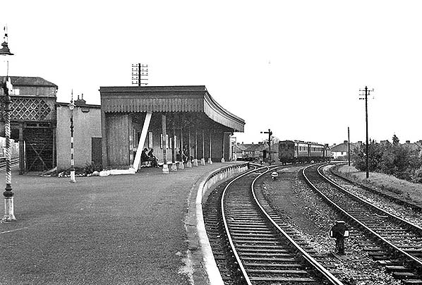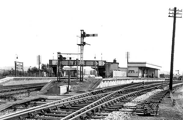 ![]() Dunton Green's branch platform in August 1950 with a train arriving from Westerham. A few passengers are waiting for the return journey along the branch. The train is one of the ex-steam rail-motor push-and-pull sets. The locomotive is unidentified and could have been from classes R, R1 or H at this time. The track through the platform pre-dated the branch and began life as a siding but was probably realigned when the branch platform was built. The track branching off at the end of the platform led to the rather basic goods yard. This and, of course, the track through the platform was to outlive the branch by a number of years. Two Southern style ground signals are visible, the nearest one having its back to the camera. The piebald lamp standards were a hangover from the blackout during WW2. Southern 'target' namebplates can be seen fixed to the lamps. Unlike Westerham branch stations, Dunton Green would go on to receive BR totem namaplates. The building between the branch shelter and the footbridge is an electricity sub-station with a covered way out of view in front which connected all three of the station's platforms. 'Covered way' was an archaic railway term for a covered footbridge and was also applied to other structures such as canopies over station entrances.