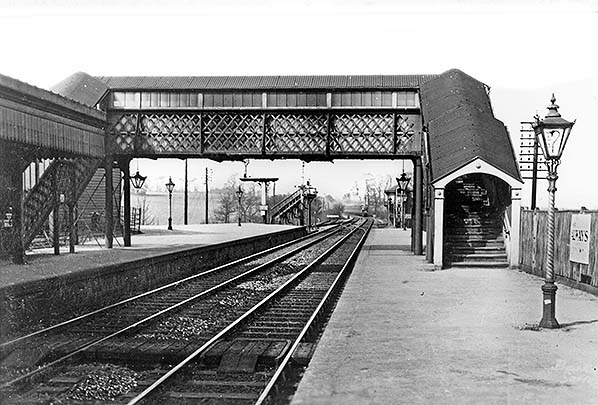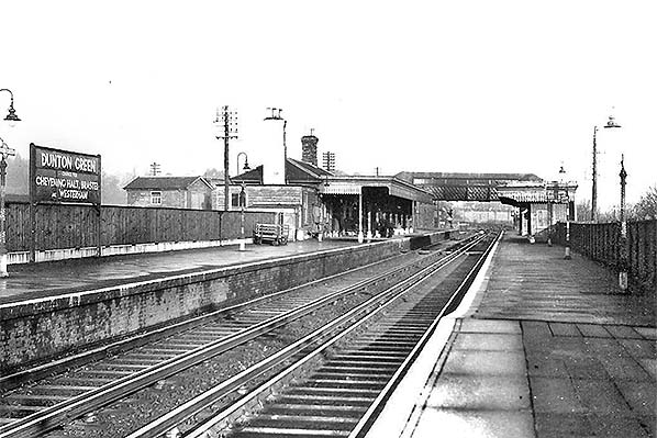 Dunton Green Station Gallery 2: Before 1935 - June 1959 ![]() A view, probably from the early 1930s and prior to electrification being extended to Sevenoaks in 1935, from Dunton Green's main line platforms looking north towards Knockholt and London. A train can be seen approaching in the distance. The Westerham branch platform is on the far left and largely out of view but the connection to the branch can be seen in the distance. Following relocation of the signal box, visible beyond the platform ahead of the camera, an aerial ropeway system was installed to convey the Westerham branch token to and from the signal box and branch platform. The odd-looking structure at the end of the up platform is the elevated stage at the west end of the ropeway. Plenty of gas lighting can be seen with its Sugg's Windsor pattern casements, as can examples of the SER barley-sugar twist standards. The L&SWR also used this design but the two could be distinguished by the more pronounced twist of the SER design. The advertisement at extreme right appears to be a poster rather than an enamel example. Unfortunately it is unreadable. Smoke deflector plates can just be seen fixed to the underside of the footbridge.