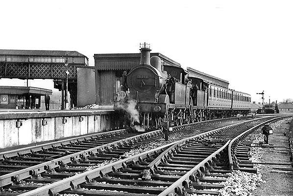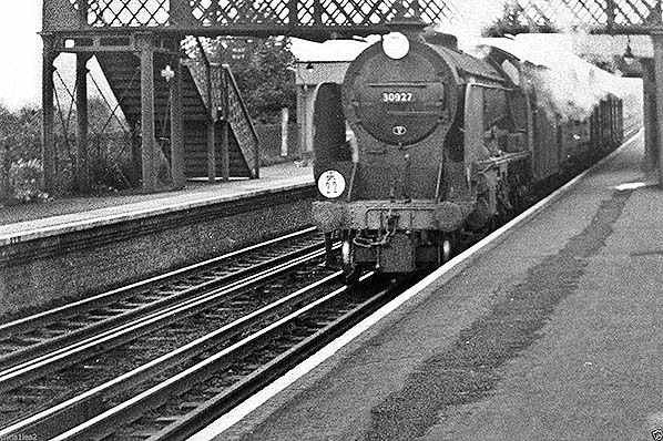 Photo from John Mann collection ![]() Maunsell Schools class 4-4-0 No.30927 'Clifton' passes Dunton Green with what appears to be a short parcels train sometime in the 1950s. The class of 40 locomotives, all named after public schools, are said to have been built to the restricted Hastings gauge although the truth behind this claim is something of a mystery to this day and the loading gauge may have come about coincidentally as a result of attempts to reduce axle loading. The cab, however, does seem to have been designed at the outset for the Hastings gauge. Whatever the truth may be, the class was a familiar sight throughout Kent and parts of Sussex. The headcode discs suggest that this loco is working between Dover and Bricklayers Arms. She was based at this shed for much of the 1950s and survived until January 1962. A Southern 'target' nameplate can be seen beneath the footbridge pier on the left.
